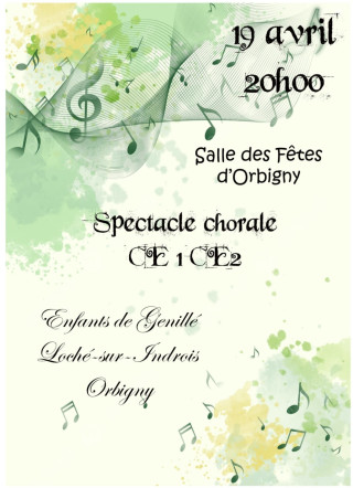 A vos agendas : les élèves de CE1 et de CE2 du Montrésorois sont heureux de vous présenter leur spectacle de chorale vendredi 19 avril à 20 heures à la salle des fêtes d'Orbigny.