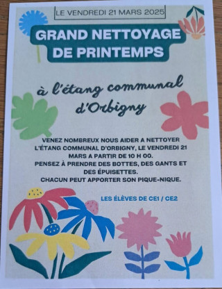 Vendredi 21 mars, les élèves de CE1/CE2 de l'école d'Orbigny vous convient à un grand nettoyage de printemps à partir de 10 heures !