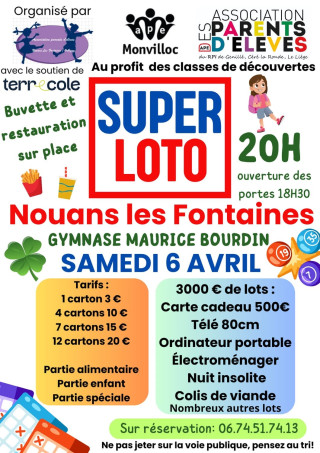 Rendez-vous au Loto organisé par les trois Associations de parents d'élèves le 6 avril prochain à Nouans-les-Fontaines