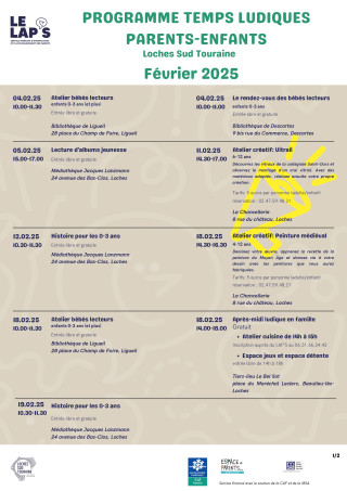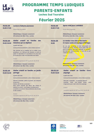Voici le programme des ateliers parents-enfants de février 2025 organisé par le LAP'S de la communauté de communes Loches Sud Touraine.