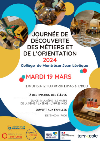 📆 TERRECOLE organise le mardi 19 mars le forum des métiers au collège de Montrésor pour les élèves du CE1 à la troisième et pour l'ensemble des parents et des habitants de 15 heures à 17 heures !