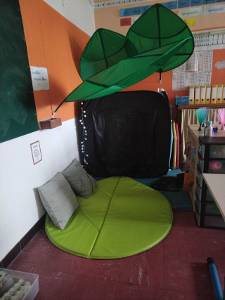 "Notre espace bulle d'air est constitué d'un espace tente, et d'un espace extérieur avec tapis et coussins, pouvant accueillir jusque 7 élèves. Une colonne de jeux sensoriels est également mise à disposition (labyrinthe de respiration, balles lumineuses, casques antibruits...).